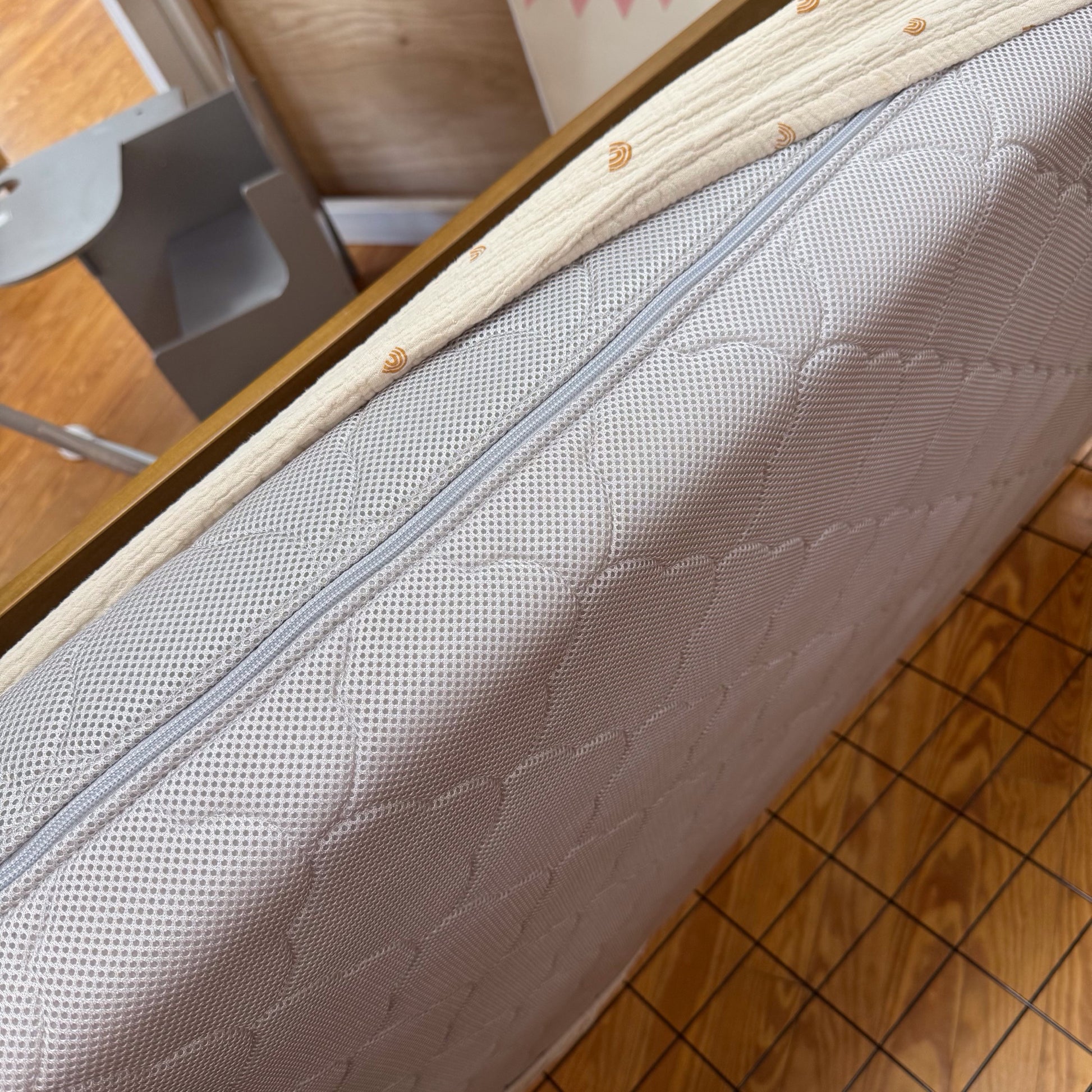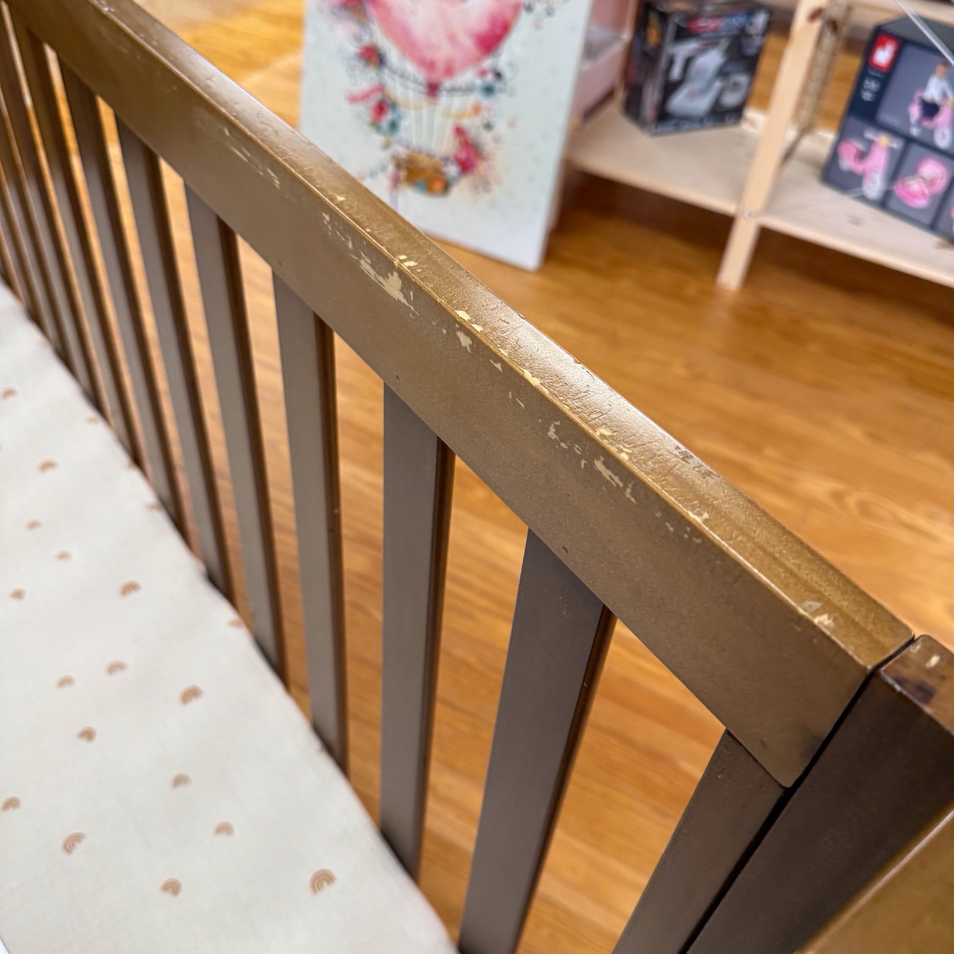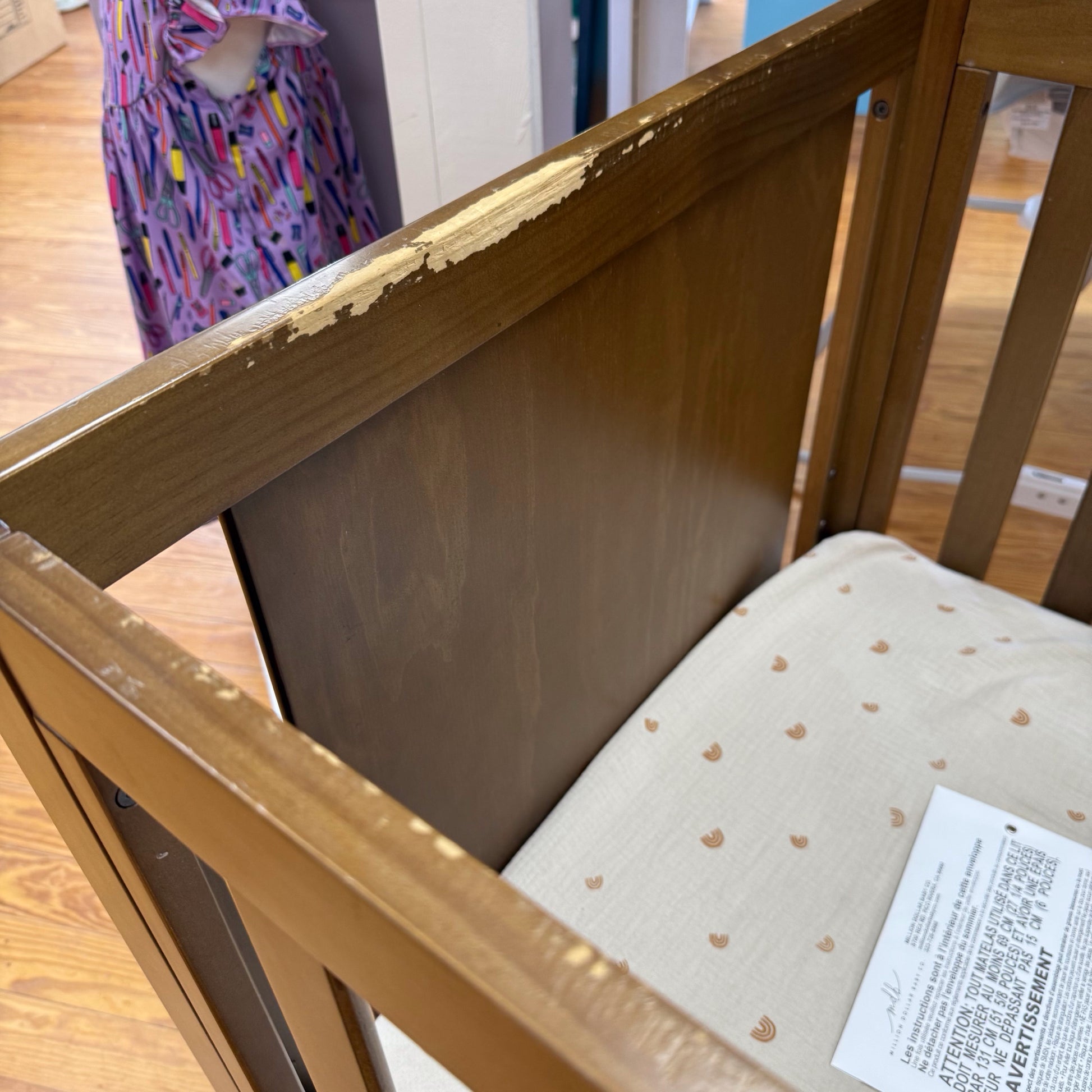 Please see pics for some wear at the top of the crib, could be touched up with a stain pen.